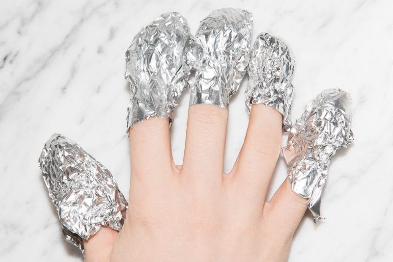 Khi sử dụng giấy bạc để tháo sơn gel, hãy chuẩn bị thêm một ít bông gòn và dung dịch tẩy móng. Để bắt đầu tháo sơn gel bằng giấy bạc, bạn cần chú ý thoa kem dưỡng lên móng trước một vài phút. Sau đó hãy dùng một ít bông gòn đã tẩm dung dịch chấm đều lên các đầu móng tay và quấn giấy bạc lớp bên ngoài. Đợi khoảng 15 phút và bóc lớp giấy đã quấn vào các ngón, bạn sẽ thấy lớp gel đã hoàn toàn được loại bỏ.